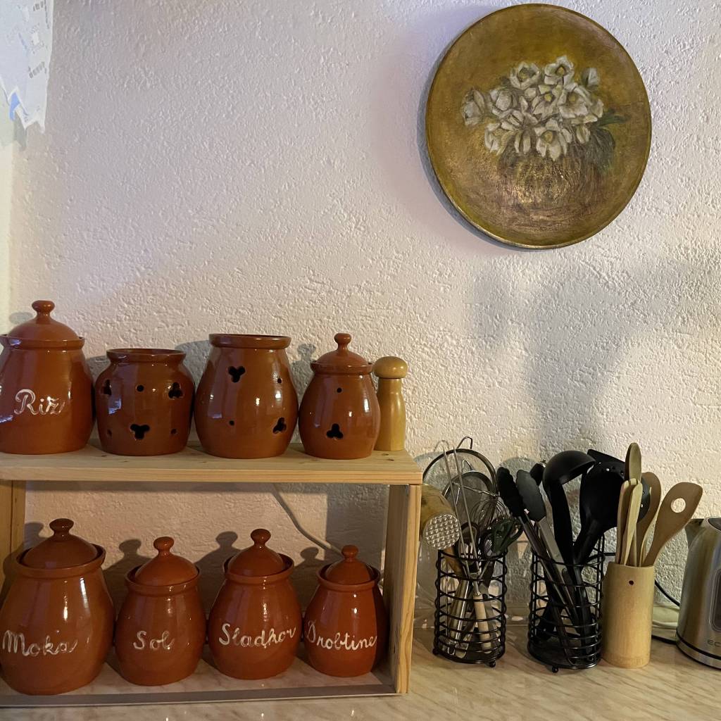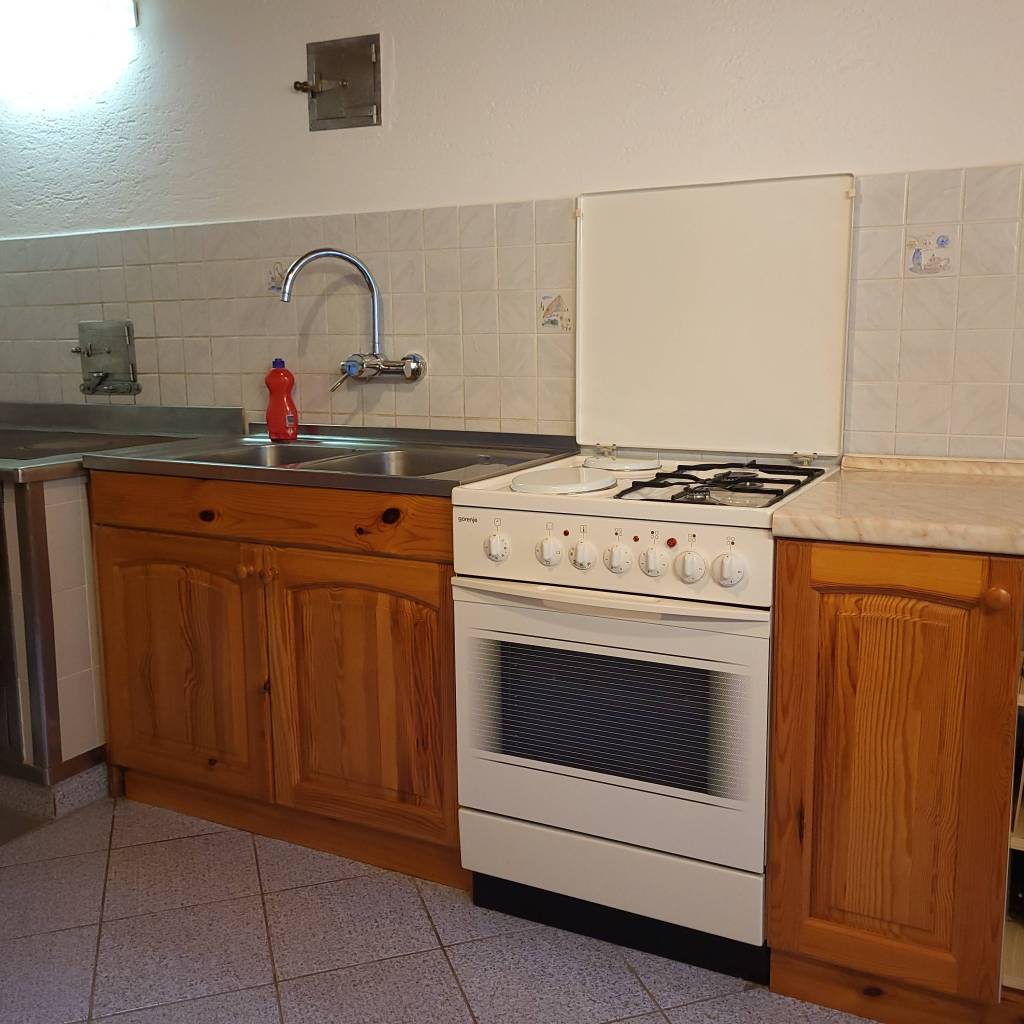 V kuhinji najdete vse kar potrebujete za osnovno kuhanje. Plinski in električni štedilnik s pečico, hladilnik, ločen zamrzovalnik, palični mešalnik, multipraktik, toaster, stepalnik, posodo in ponve, ter še več.