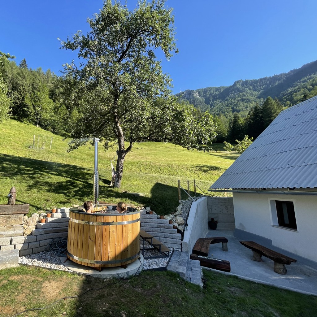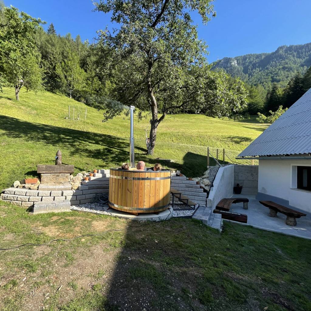 Ob hladnih večerih se lahko pod zvezdami pogrejete in sprostite v vroči kadi na drva.