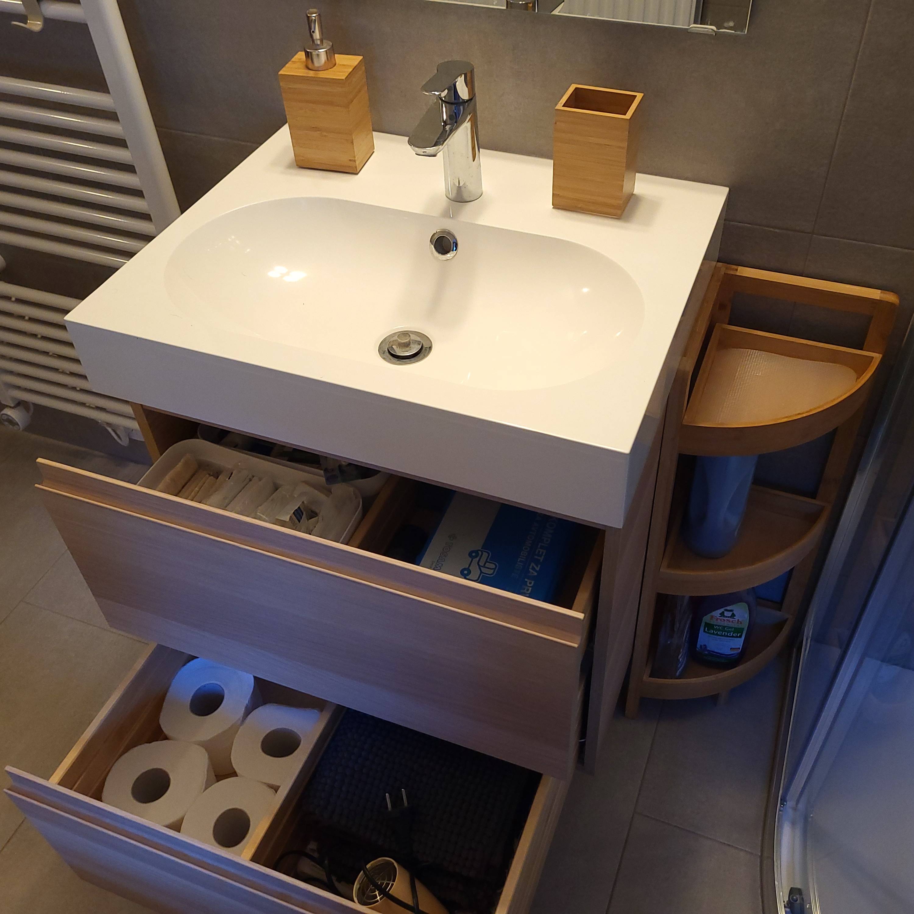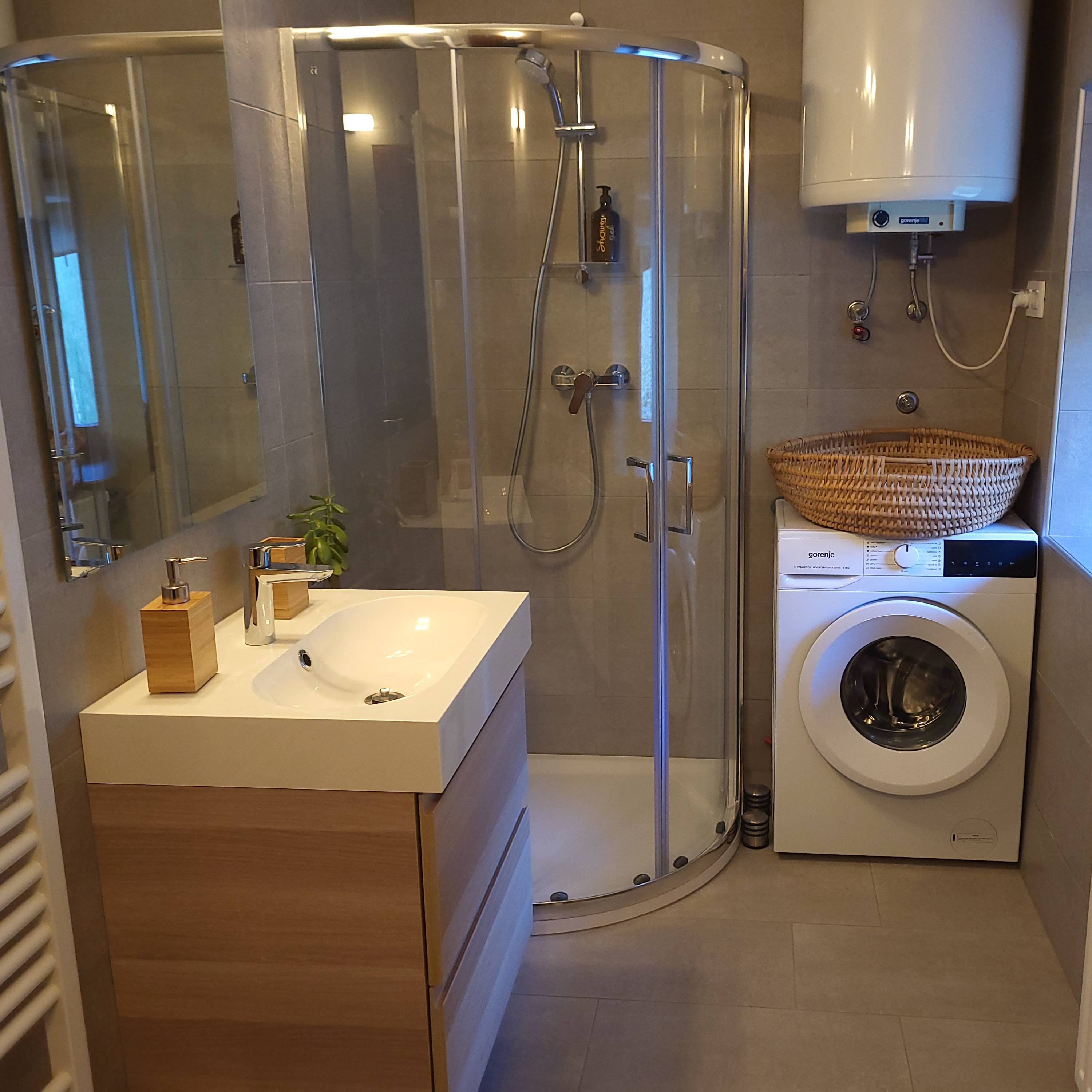 The bathroom contains a shower cabin, sink, and toilet. Hot water is in the water heater above the washing machine.